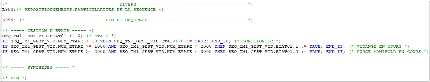 Pour ces raisons, les états de la fonction sont écrits en dernier. Il faut toujours déclarer au moins l’état « Fonction en cours active ». Il sert de contrôle et de verrouillage dans le pilotage des actionneurs.